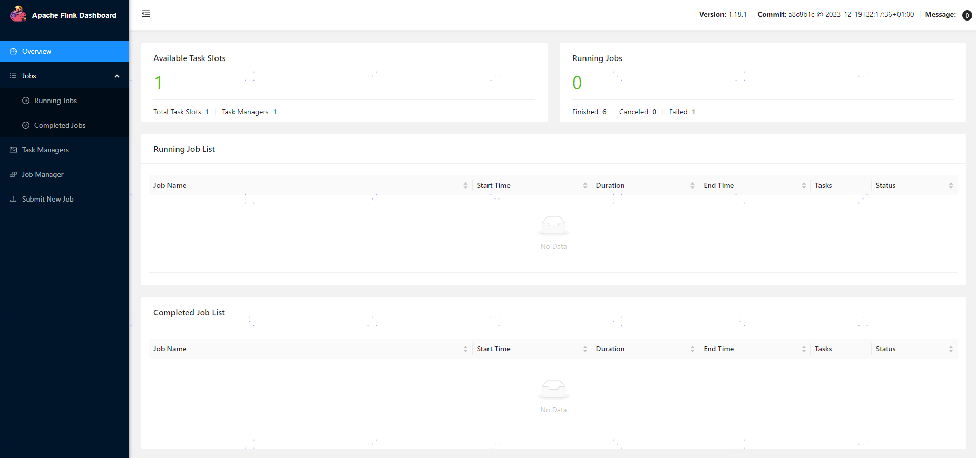 如下两个容器启动成功,可以看到 web 端口为 18081,taskmanager 启动一个,包含 5 个任务槽