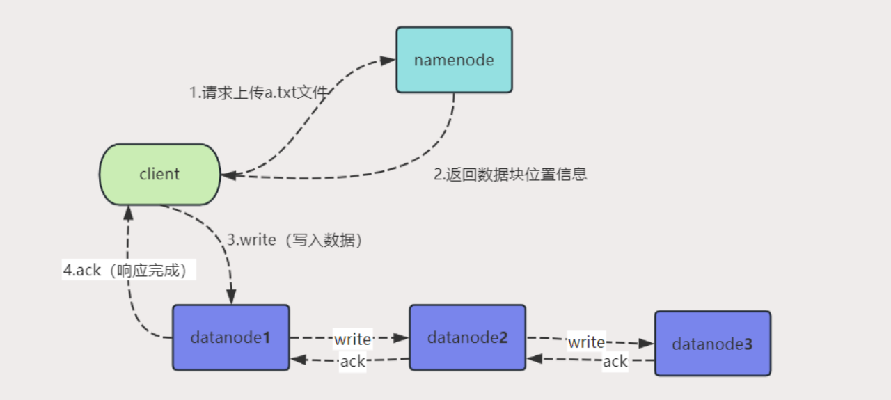 - 客户端将要写入的数据块划分为若干数据包,并根据数据块位置信息,与对应的DataNode数据节点建立连接,将数据包传输给DataNode数据节点。