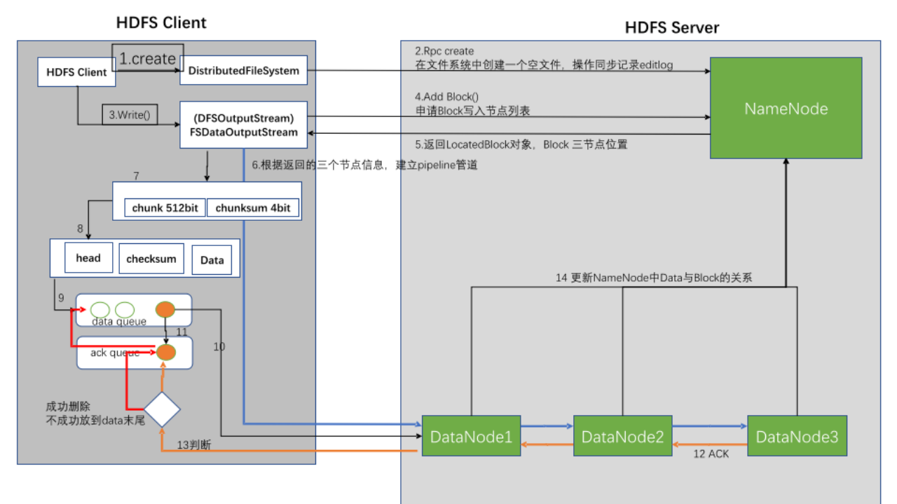 - DFSOutputStream维护一个确认队列,等待管线中所有DataNode的确认信息。只有当收到管线中所有DataNode的确认信息后,数据包才从确认队列删除。
