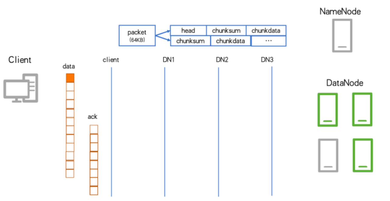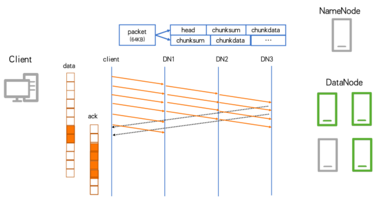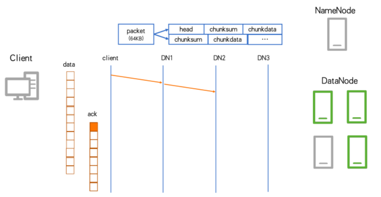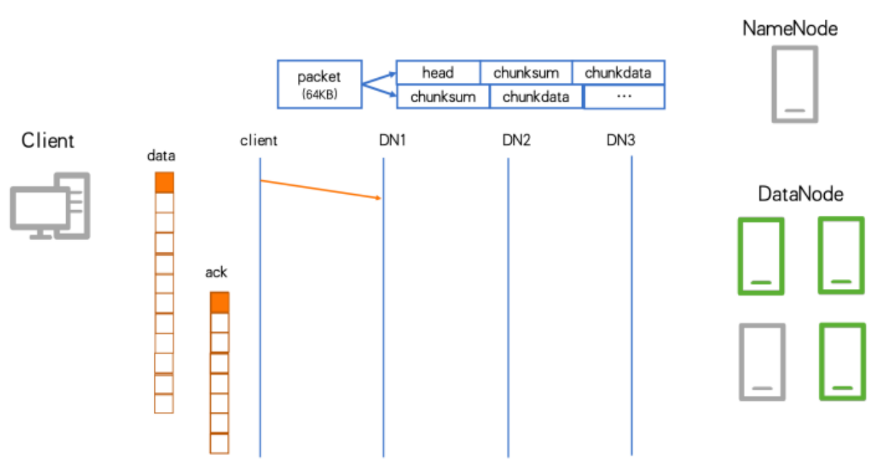 2. Client发送到DN1节点,并且同步将数据拷贝一份到ACK队列【下图右】