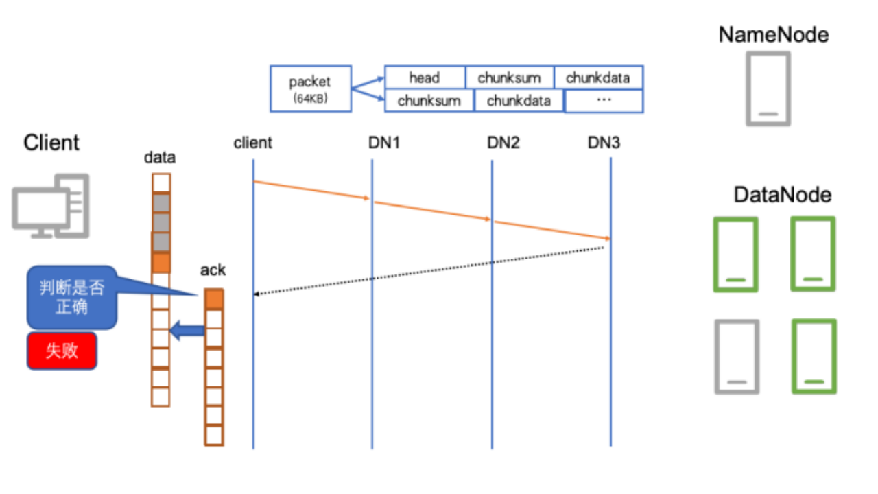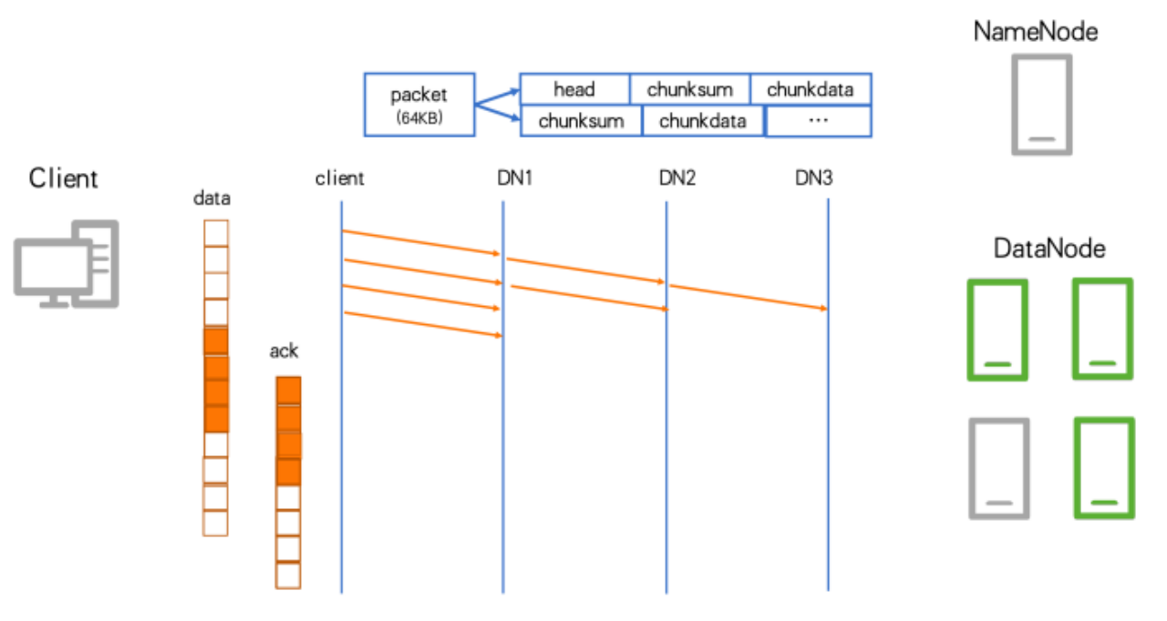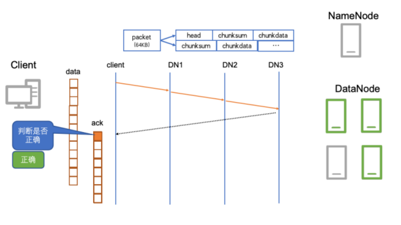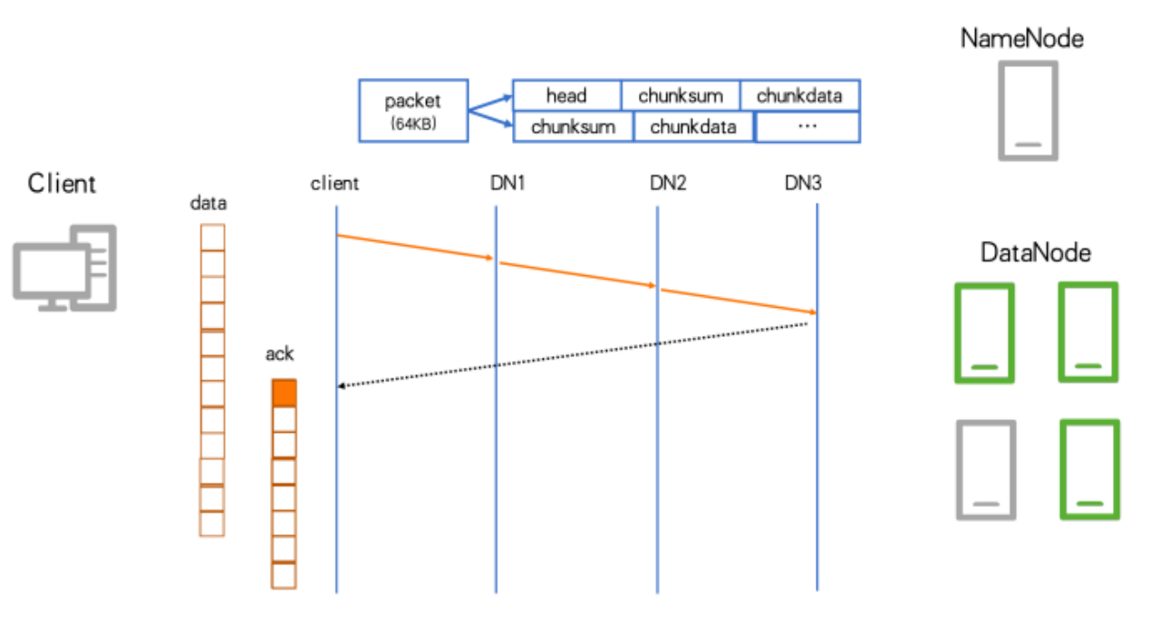 2. Client发送到DN1节点,并且同步将数据拷贝一份到ACK队列【下图右】