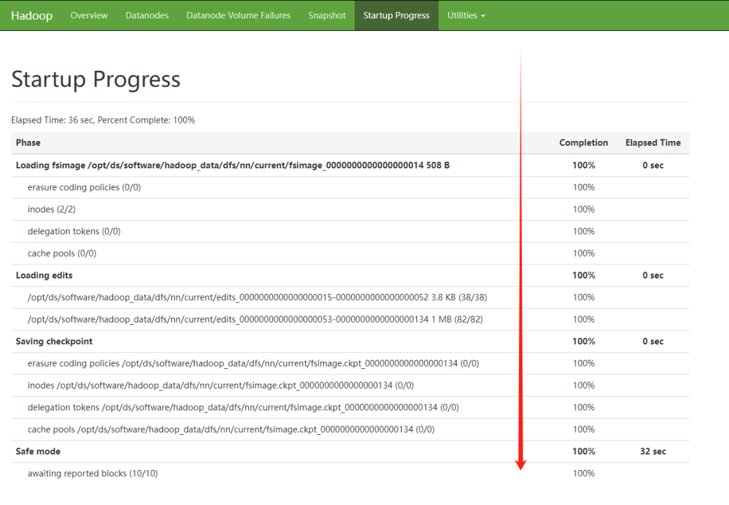 - 接收到足够多的来自 datanode的数据块报告并退出安全模式。