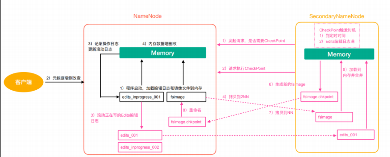 - Secondary NameNode询问NameNode是否需要CheckPoint。直接带回NameNode是否执行检查点 操作结果。