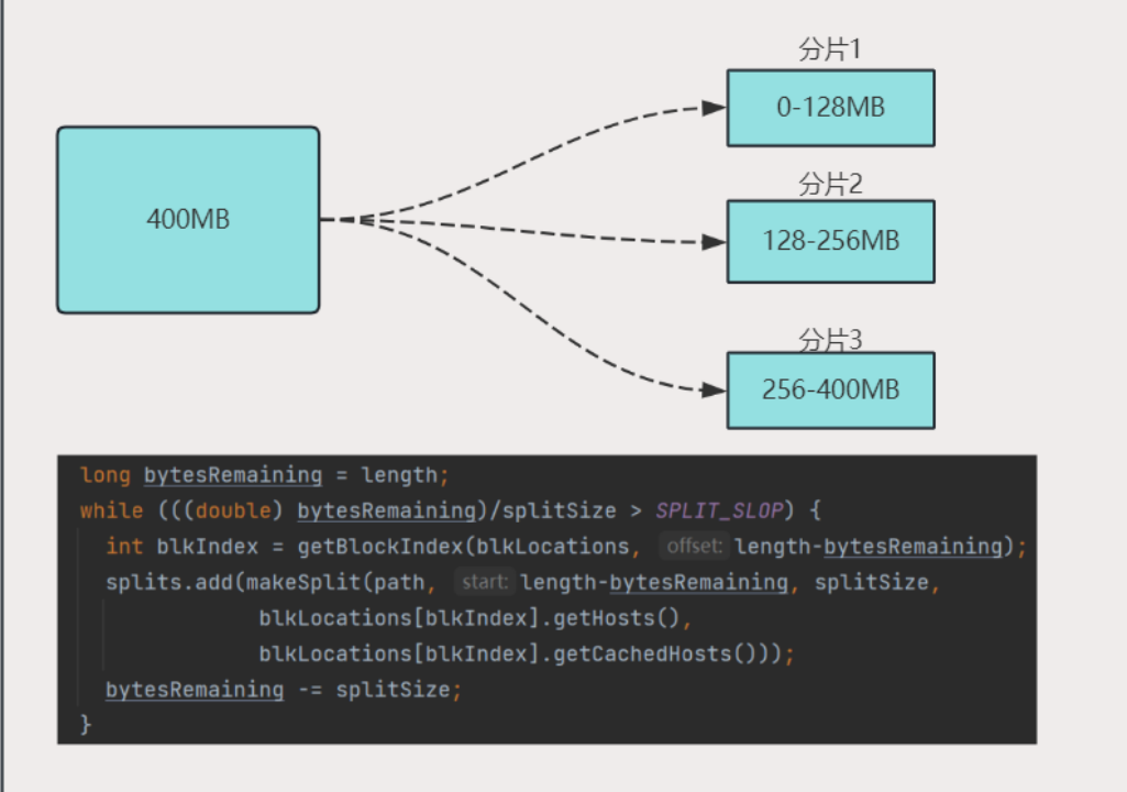 假如在默认参数情况下,读取一个400MB的文件,文件整体的切分如下: