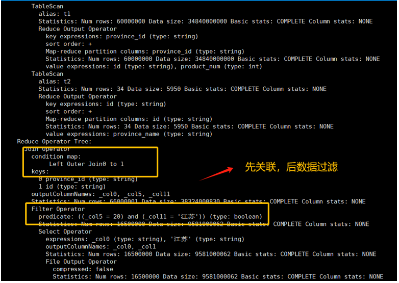 通过执行计划可以看到,关闭谓词下推后,Hive 会先执行 JOIN 操作,将两张表的所有数据关联起来,然后再对这个庞大的中间结果集进行 WHERE 过滤。如果两张表数据量都很大,执行效率会非常低下。