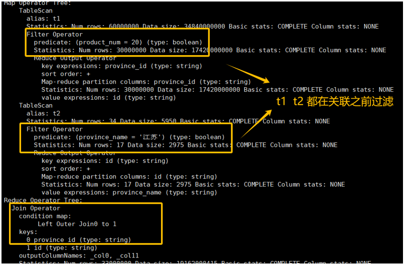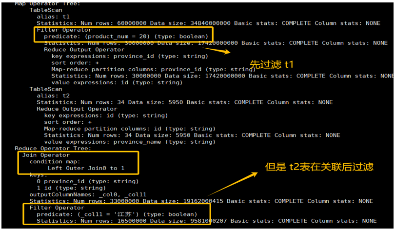 开启后,从执行计划中可以明显看出,过滤操作(Filter Operator)被移动到了 JOIN 操作之前。Hive 会先在各自的表上应用 WHERE 条件,用过滤后的小数据集去执行 JOIN,从而大大减少了关联的数据量,提升了整体执 行效率。
