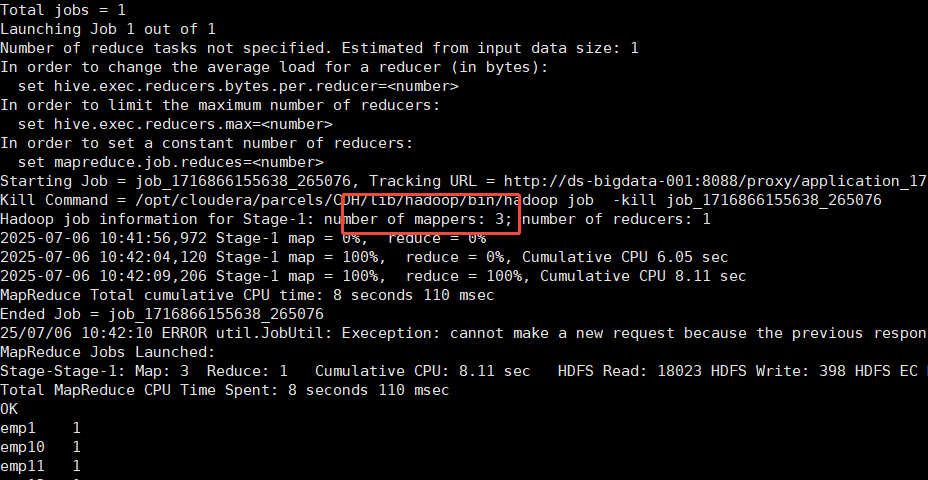再次运行查询,观察任务的执行日志。可以看到 Hive 为这个查询启动了多个作业(Jobs),并且并行地提交了它们,这证明了没有依赖关系的子查询 t1 和 t2 正在同步执行。