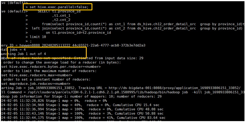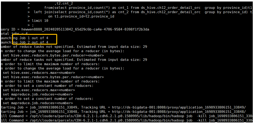 从上图的运行日志中,Launching Job 1 out of 4 和 Launching Job 2 out of 4 等信息清晰地表明,Hive 将查询拆分成了多个独立的作业,并同时提交执行,从而达到了并行的目的,有效缩短了整体查询时间。