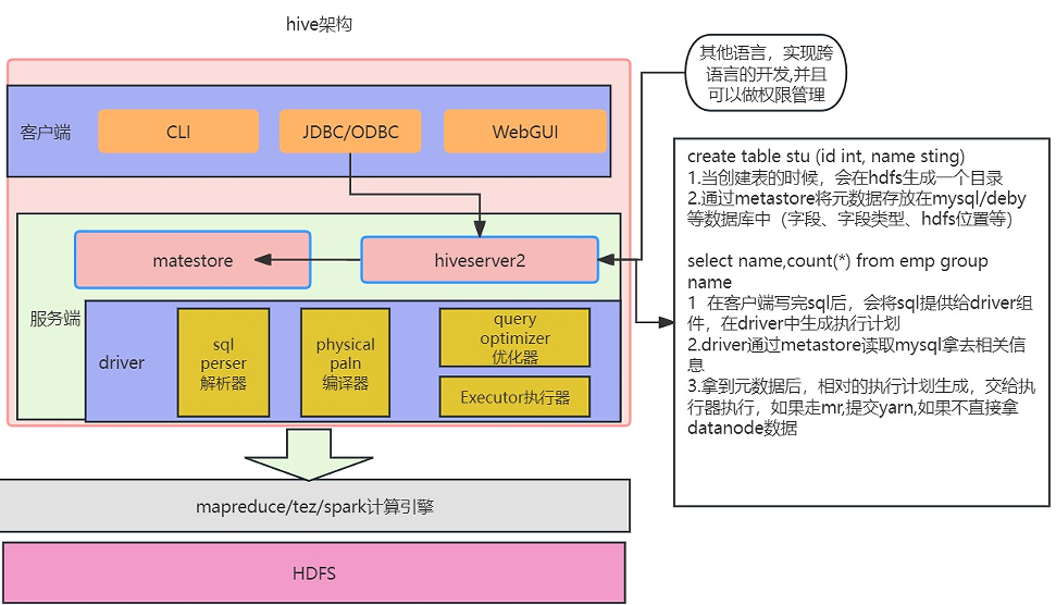 - hiveServer2服务:hiveServer2服务是Facebook开发的一个软件框架,它用来进行可扩展且跨语言服务的开发。Hive集成了该服务,可以让不同的编程语言调用Hive的接口。