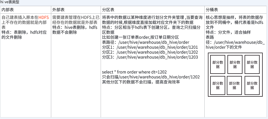 Hive 有四种基本的表类型:内部表(Managed Table)、外部表(External Table)、分区表(Partitioned Table)和分桶表(Bucketed Table),它们分别对应不同的业务需求。