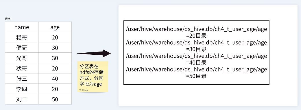 使用 PARTITIONED BY 关键字定义分区字段。分区字段是表的“伪列”,它不存储在数据文件中,而是体现在 HDFS 的目录结构上。