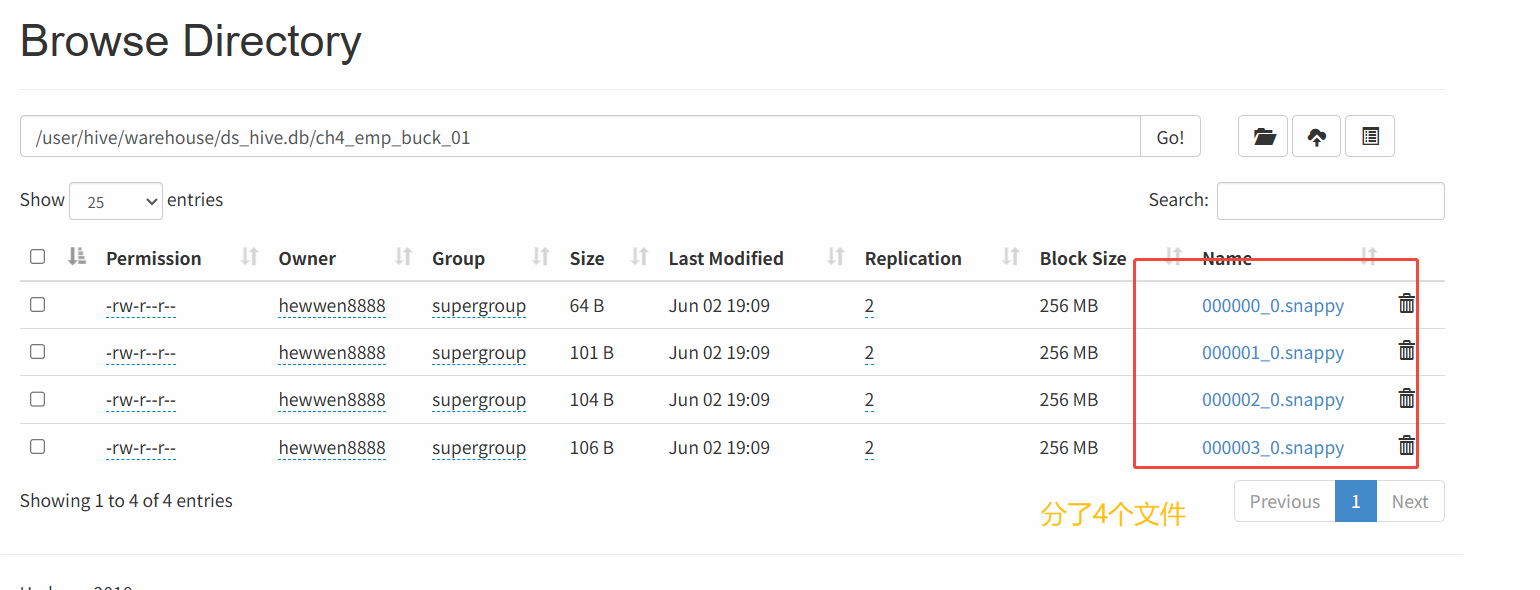 在 HDFS 对应的表目录下,可以看到生成了 4 个数据文件,代表 4 个桶。