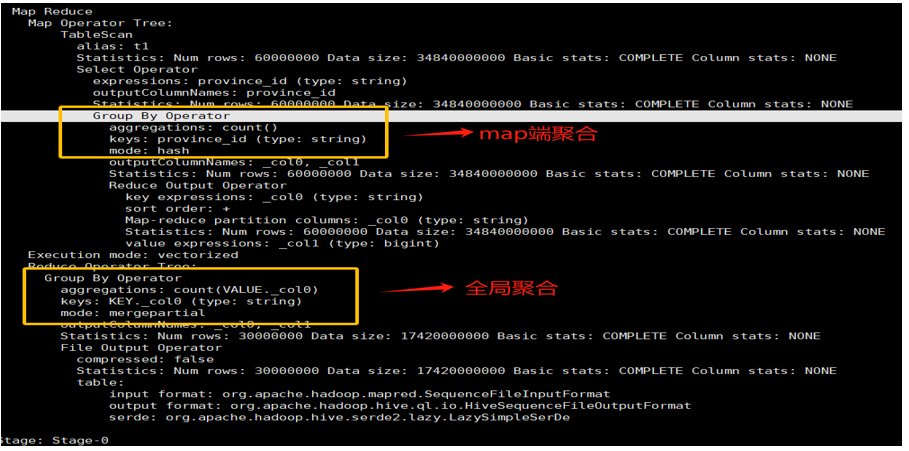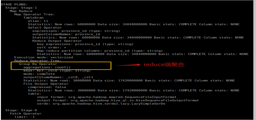 GroupByOperator (mode: final)->Select->FileOutput。- Reduce 阶段接收的是经过 Map 端局部聚合后的中间结果,数据量已大大减少,然后再进行最终的合并聚合。