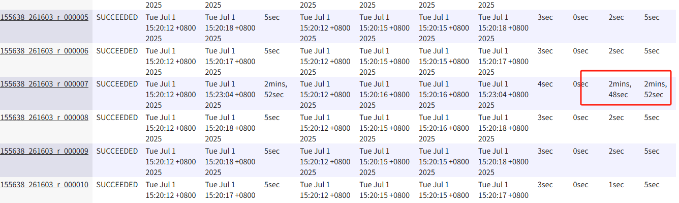 - YARN 日志分析:从 YARN 的任务监控界面可以看到明显的“长尾”任务。