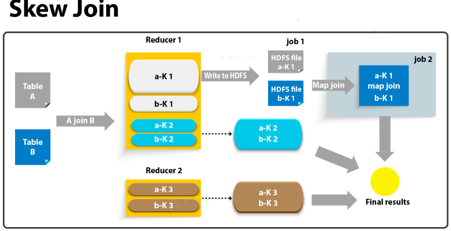 并不是所有的Join都能满足Map Join,这里我们又出现一种优化方案,那就是Skew。Skew Join 是一种更为智能的优化,它在运行时自动检测倾斜的 key。处理时,它会将倾斜的 key 和非倾斜的 key 分开处理:非倾斜部分走常规的 Reduce Join,而倾斜的 key 则单独用 Map Join 的方式处理。最后将两部分结果合并。