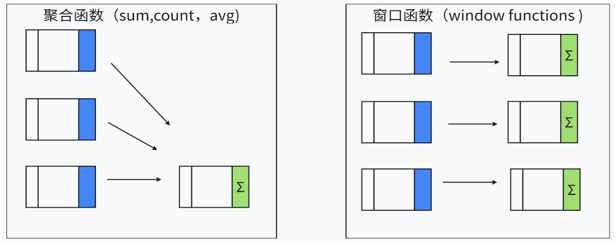 它与普通聚合函数的最大不同在于:聚合函数对每个组只返回一行,而窗口函数为每个组返回多行(通常是保留原始行数)。